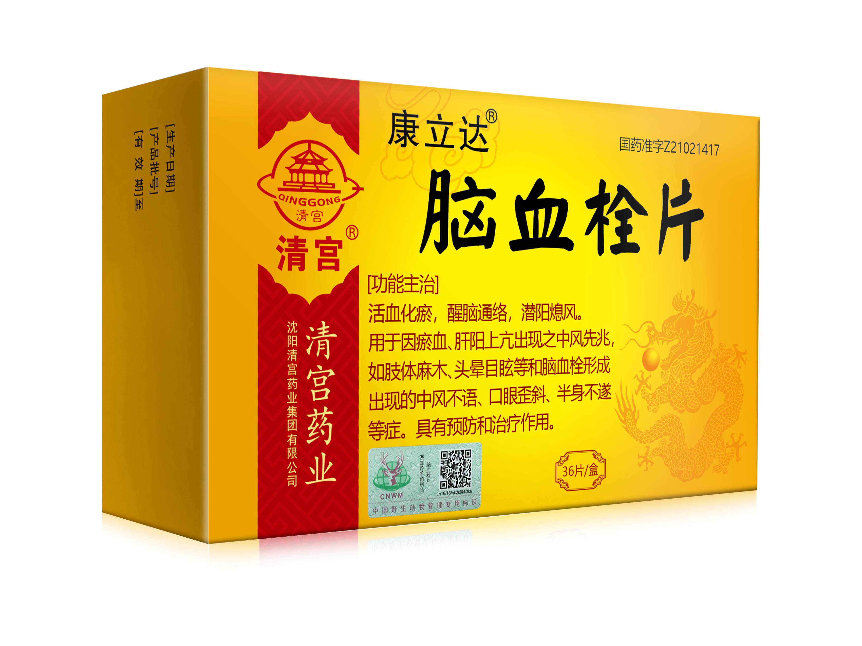 功能主治:活血化瘀,醒脑通络,潜阳熄风。用于因瘀血、肝阳上亢出现之中风先兆,如肢体麻木、头晕目眩等和脑血栓形成出现的中风不语、口眼歪斜、半身不遂等症。具有预防和治疗作用。